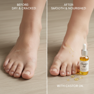 Minyak jarak sangat efektif untuk melembapkan kulit. Mengoleskannya pada kaki yang kering dan pecah-pecah dapat menghaluskan kulit kasar, mencegah pengelupasan, dan mengurangi kapalan. Minyak ini mengunci kelembapan dan menutrisi kulit selama tidur.