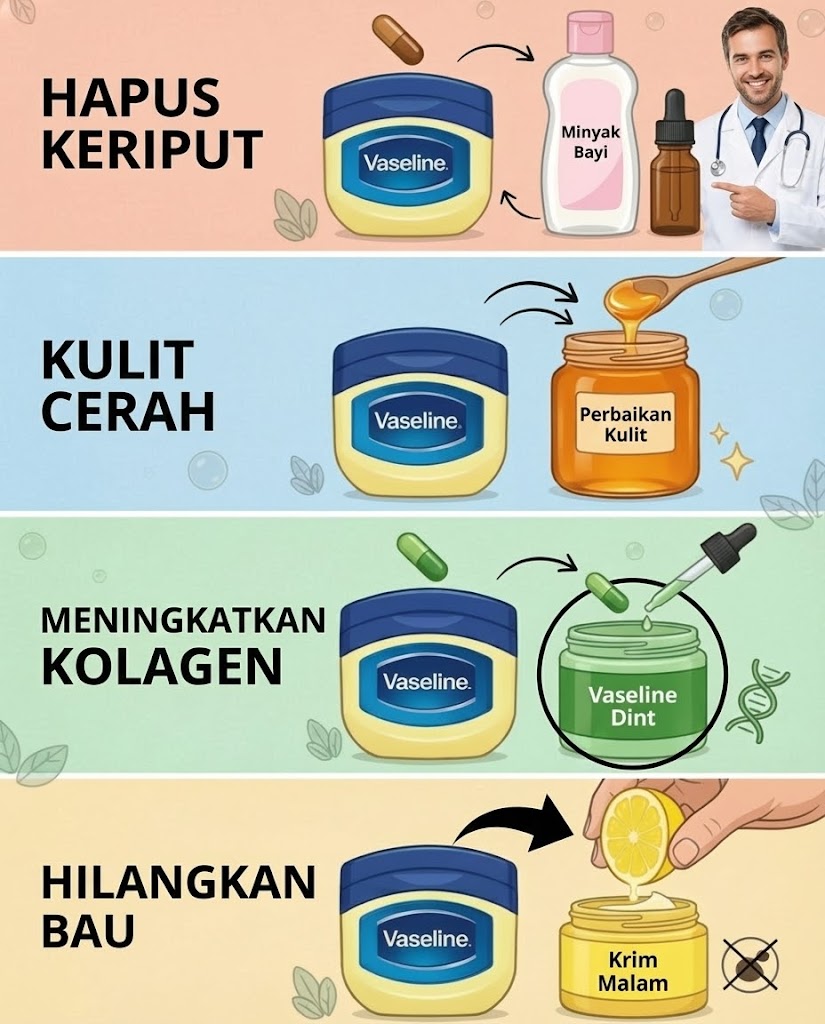 Setelah serum malam, tutup wajah dengan lapisan tipis Vaseline. Bangun pagi dengan kulit glowing, kenyal, dan lembap total. Bahkan dokter kulit pun mengakui: ini lebih efektif dari krim malam seharga jutaan.
