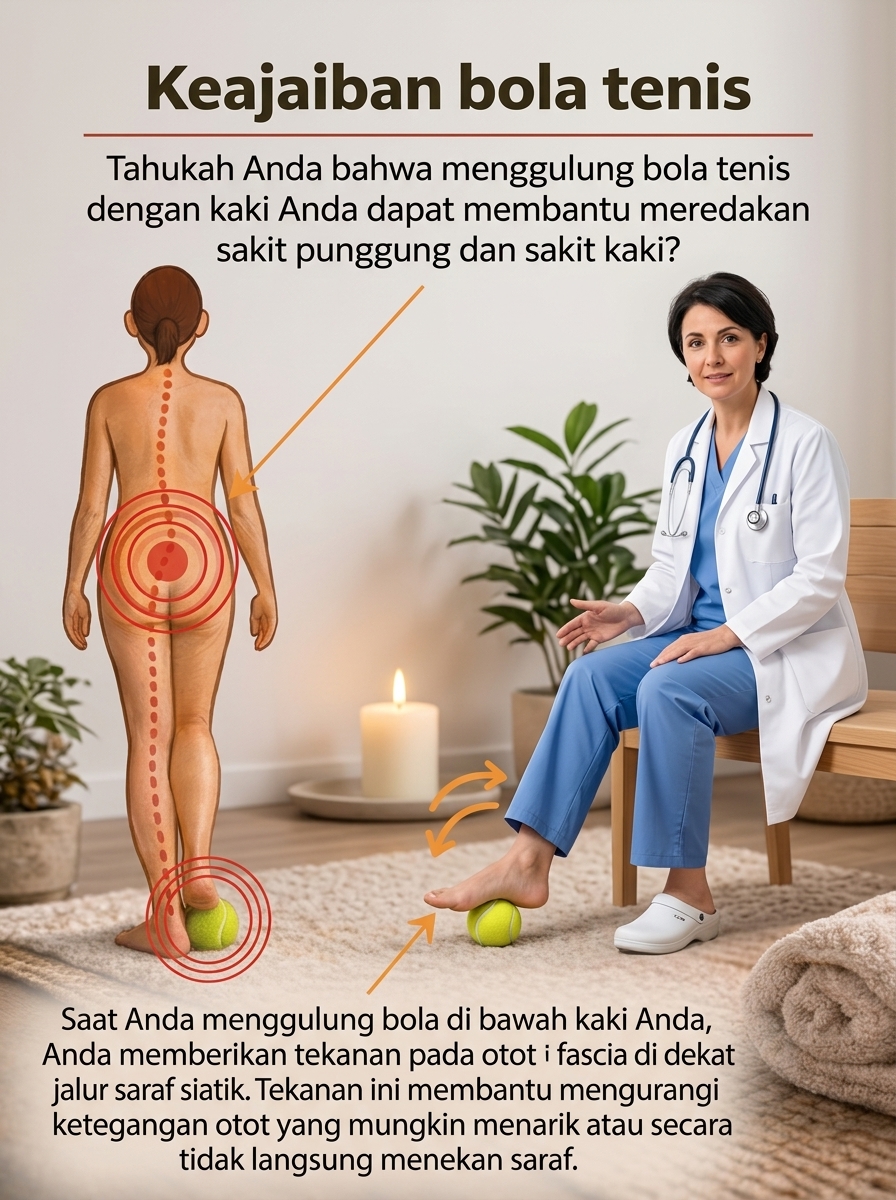 Sebuah bola tenis biasa ternyata bisa menjadi alat efektif untuk meredakan nyeri kaki dan mengurangi ketegangan yang menjalar ke seluruh tubuh. Teknik ini banyak digunakan dalam pijat mandiri dan pelepasan myofascial, dan Anda bisa melakukannya sendiri hanya dalam beberapa menit.